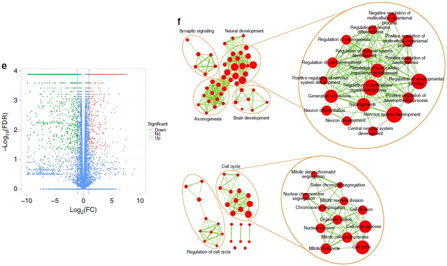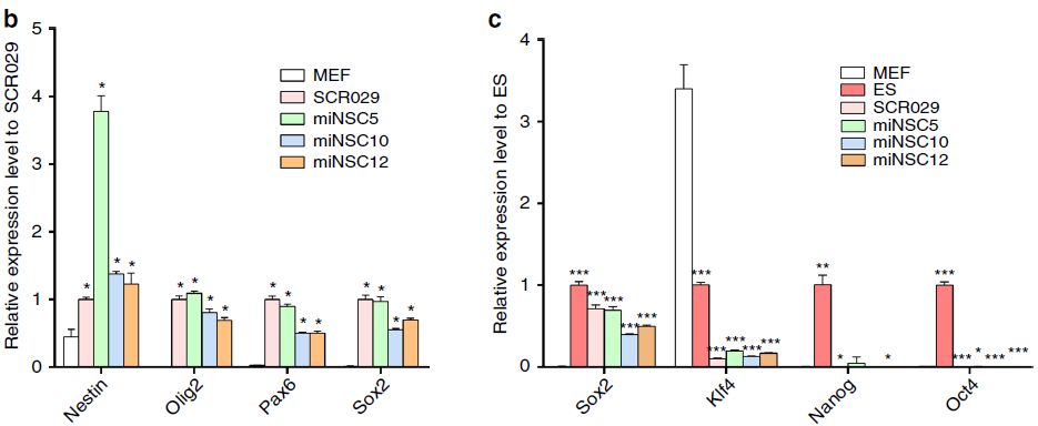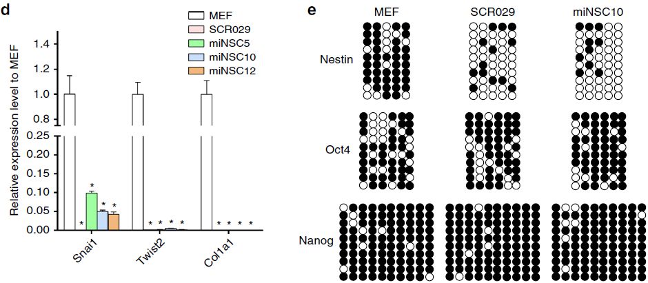 為了進(jìn)一步確認(rèn)這些miNSC的NSC身份,作者對(duì)miNSC10、SCR029和MEF細(xì)胞進(jìn)行了RNA-seq分析。miNSC10、SCR029和MEF細(xì)胞中基因表達(dá)水平的散點(diǎn)圖顯示,miNSC10和SCR209細(xì)胞的基因表達(dá)水平相似,但均與MEF存在顯著差異(圖3a-c)。與這些結(jié)果一致的是,聚類分析也顯示出miNSC10和SCR029細(xì)胞之間有很高的相似性,但它們與MEF之間有很大的差異(圖3d)。與MEF相比,miNSC中有許多基因表達(dá)水平下調(diào)或上調(diào)(圖3e)。作者對(duì)上調(diào)基因進(jìn)行基因集富集分析(GSEA),發(fā)現(xiàn)了兩組主要的富集基因GO term(圖3f)。其中一組在與神經(jīng)發(fā)育相關(guān)的GO term中富集,如神經(jīng)發(fā)生、神經(jīng)元分化、神經(jīng)系統(tǒng)發(fā)育、神經(jīng)發(fā)生調(diào)節(jié)、大腦發(fā)育和軸突發(fā)生。另一組富集在細(xì)胞分裂GO term,包括細(xì)胞分裂、有絲分裂細(xì)胞周期、核分裂、姐妹染色單體分離、細(xì)胞周期調(diào)控。這些數(shù)據(jù)與miNSC作為NSC及其增殖和自我更新能力是一致的。與此一致的是,進(jìn)一步的分析顯示,盡管有一定的差異,但miNSC10、SCR029、NS528(小鼠ES細(xì)胞來(lái)源的NSC)和ciNSC10 (化學(xué)誘導(dǎo)MEF形成的NSC)細(xì)胞之間的相似性比MEF更大。