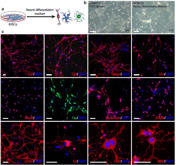 作者想要解決的問(wèn)題是由非神經(jīng)前體細(xì)胞TF Ptf1a重編程的miNSC是否可以與NSC 一樣,具有分化成神經(jīng)元、星形膠質(zhì)細(xì)胞和少突膠質(zhì)細(xì)胞的潛力(圖4a)。當(dāng)在神經(jīng)分化培養(yǎng)基中培養(yǎng)時(shí),短短幾天內(nèi),miNSC就發(fā)生了穩(wěn)健的形態(tài)學(xué)變化,細(xì)胞體積變小、普遍的神經(jīng)突擴(kuò)張(圖4b)。在培養(yǎng)的2-3周,許多細(xì)胞分化為Tuj1、Map2、Dcx、NeuN、Tau、peripherin或GABA免疫的神經(jīng)元(圖4c)。3周時(shí)的定量顯示,83.3%的細(xì)胞呈Tuj1陽(yáng)性(圖4e)。此外,不同miNSC細(xì)胞系(miNSC5、10、12)顯示類似的分化成Tuj1或Map2免疫的神經(jīng)元的能力(補(bǔ)充圖8)。在星形膠質(zhì)細(xì)胞分化條件下,87.2%的分化細(xì)胞形成神經(jīng)膠質(zhì)原纖維酸性蛋白(GFAP)免疫的星形膠質(zhì)細(xì)胞(圖4 c,e),少突膠質(zhì)細(xì)胞分化培養(yǎng)基中,miNSC能夠分化為O1、CNP或MBP免疫的少突膠質(zhì)細(xì)胞,而26.6%的分化細(xì)胞為O1陽(yáng)性(圖4 c,e)。因此,ptf1a重編程的miNSC具有三能性,能夠分化為神經(jīng)元、星形膠質(zhì)細(xì)胞和少突膠質(zhì)細(xì)胞。