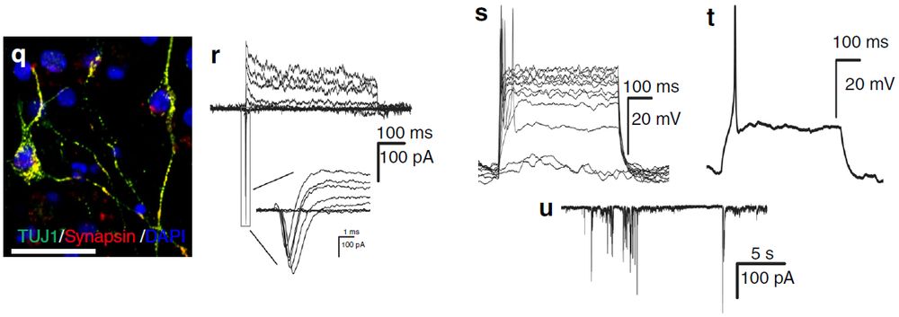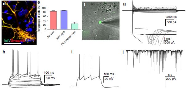 根據(jù)qRT-PCR結(jié)果,ptf1a重編程的hiNSC幾乎不表達(dá)多能性基因OCT4和NANOG。相反,它們高表達(dá)NSC標(biāo)志蛋白,包括SOX2、PAX6、NESTIN、OLIG2和FABP7(圖9 e-i)。體外分化試驗(yàn)表明hiNSC具有三能性(圖9p,j-n)因此,Ptf1a具有類似的活性,可將人類成纖維細(xì)胞重編程形成三能性NSC。作者通過(guò)突觸素染色標(biāo)記試驗(yàn)、電生理特性分析表明,ptf1a重編程的miNSC能夠分化為功能神經(jīng)元(圖9q,r-u)。