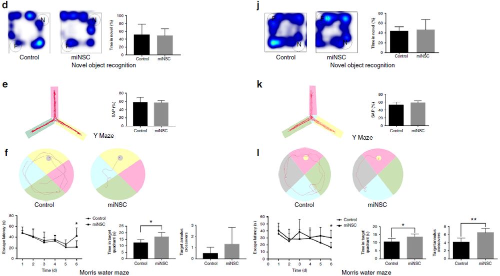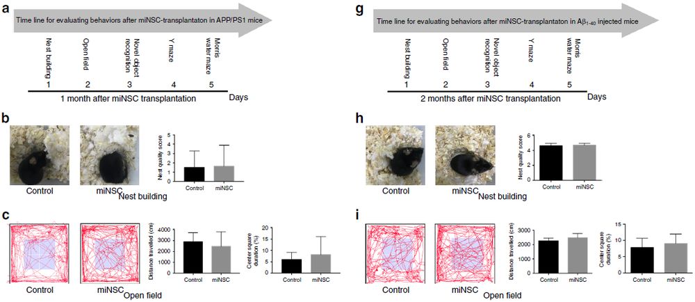 作者也評(píng)估了miNSC對(duì)β-淀粉樣蛋白1-40(Aβ1-40)損傷AD小鼠模型的治療潛力。首先確定了Aβ1-40損傷小鼠的學(xué)習(xí)和記憶障礙小鼠與AD類似。將GFP標(biāo)記的miNSC在注射Aβ1-40 2周后移植到相同位置。兩個(gè)月后,作者進(jìn)行了同樣的行為學(xué)試驗(yàn),發(fā)現(xiàn)移植miNSC可以顯著提高APP / PS1和Aβ1-40損傷AD小鼠模型的空間學(xué)習(xí)和記憶能力,療效與ESC來(lái)源的NSC相似(圖6g-k)。
