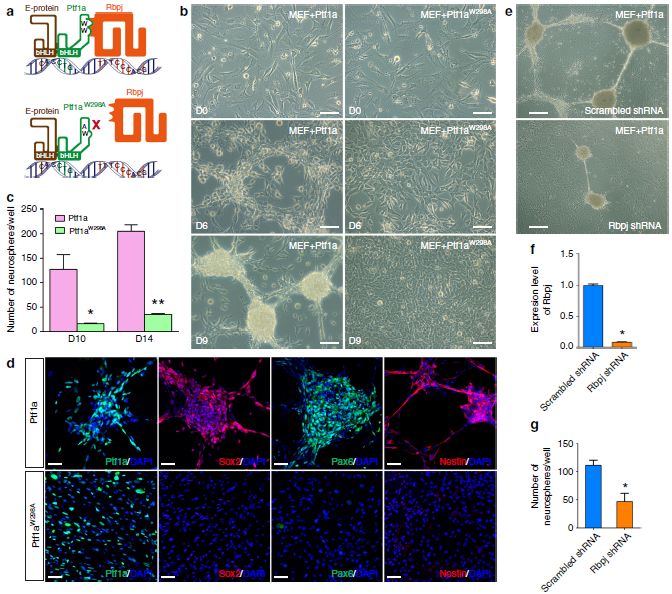 先前有研究表明,Ptf1a與Rbpj、E-蛋白以非Notch信號(hào)依賴性方式形成DNA結(jié)合三聚體,以特化胰腺細(xì)胞系和GABA能神經(jīng)元。作者研究了Ptf1a和Rbpj之間非Notch信號(hào)依賴性的互作是否也是Ptf1a重編程所需要的。在MEF中,WB和免疫共沉淀結(jié)果顯示,Rbpj蛋白是內(nèi)源性表達(dá),外源性表達(dá)的Ptf1a可以免疫共沉淀Rbpj。將Dox可誘導(dǎo)的 Ptf1aW298A(此突變體中Ptf1a與Rbpj的互作被破壞,但仍可與E-蛋白結(jié)合)慢病毒注射到MEF中,在注射6天后,沒(méi)有發(fā)生典型形態(tài)變化以形成細(xì)胞群落,只在9—14天產(chǎn)生了少數(shù)類似正常形態(tài)神經(jīng)球的群落,而注射了野生型Ptf1a病毒的MEF則在在9—14天,在12孔板中每板產(chǎn)生了數(shù)以百計(jì)的神經(jīng)球(圖7 b,c)。類似地,MEF感染Ptf1aW298A慢病毒后未能表達(dá)NSC標(biāo)志蛋白質(zhì)Sox2、Pax6或Nestin(圖7 d)。因此,與Rbpj的互作是Ptf1a重編程的先決條件。與此一致的是,敲除MEF中Rbpj的表達(dá)后,ptf1a誘導(dǎo)的神經(jīng)球的數(shù)量減少了兩倍多(圖7e-g)。