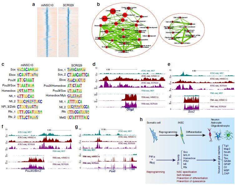 miNSC10 iNSC和SCR029 NSC的ATAC-seq結(jié)果表明,peak關(guān)聯(lián)基因富集在神經(jīng)發(fā)生、神經(jīng)元發(fā)育、大腦發(fā)育、膠質(zhì)細(xì)胞發(fā)育(圖8a, b),與NSC特征一致。在peak峰值中心300 bp窗口中鑒定新motif,說(shuō)明miNSC10和SCR029細(xì)胞都富集了類似的屬于多個(gè)TF家族的TF結(jié)合motif,TF家族包括Sox、bHLH (Ebox)、Pou3f、homeobox、Nfi和Rfx(圖8c)。相應(yīng)地,RNA-seq數(shù)據(jù)顯示,與MEF相比,這些TF基因家族的多個(gè)成員在miNSC10和SCR029細(xì)胞中上調(diào)或高表達(dá)。qRT-PCR證明,除了Sox2之外,Sox5、6、8、21在miNSC10和SCR029細(xì)胞中均表達(dá)上調(diào)。一般來(lái)說(shuō),miNSC10細(xì)胞的ATAC-seq圖譜與SCR029細(xì)胞相似,但與MEF完全不同;而對(duì)于上調(diào)的TF基因,如Olig2(bHLH)、Sox2、Pou3f2/Brn2、Pax6 (homeobox),與MEF相比,miNSC10和SCR029細(xì)胞中這些位點(diǎn)具有更多的峰和/或差異峰(圖8d-g),說(shuō)明更開(kāi)放的染色質(zhì)結(jié)構(gòu)增加了基因表達(dá)。