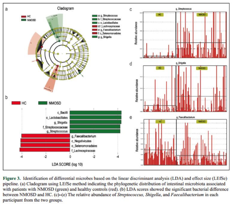 視神經(jīng)脊髓炎譜系疾病(NMOSD)是一種中樞神經(jīng)系統(tǒng)(CNS)的炎癥性自身免疫疾病,是視神經(jīng)和脊髓同時或相繼受累的急性或亞急性脫髓鞘病變。視神經(jīng)脊髓炎譜系疾病具有高復(fù)發(fā)和高致殘性,具有人種差異和性別差異(男女患病比例為1:10),通常與其他自身免疫疾病(如系統(tǒng)性紅斑狼瘡、橋本氏病等)共病。長期以來,NMOSD可通過免疫學(xué)標(biāo)記(如水通道蛋白-4抗體,AQP4-IgG)或遺傳基因標(biāo)記(如人類白細(xì)胞抗原,HLA)鑒定,與幽門螺桿菌等病原相關(guān)的抗體在NMOSD患者的腸胃中也被普遍發(fā)現(xiàn)。NMOSD患者腸道微生物的研究目前仍較少,本文采用高通量測序(NGS)和氣相色譜(GC)技術(shù),分析了NMOSD患者的腸道微生物與短鏈脂肪酸(SCFAs)變化情況。