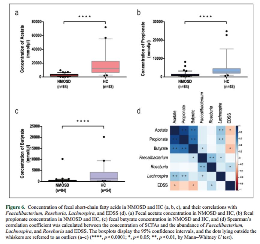 從上述研究發(fā)現(xiàn),NMOSD患者腸道中缺乏合成SCFAs的菌群,但引起該患者癥狀的機(jī)會致病菌大量繁殖。因此,本文運(yùn)用GC技術(shù)研究NMOSD與HC人群腸道SCFAs(醋酸纖維、丙酸鹽和丁酸鹽),結(jié)果發(fā)現(xiàn),NMOSD患者的3種SCFAs濃度均顯著低于HC人群(p<0.001)(圖 6a-c)。非參數(shù)相關(guān)性分析(Spearman)表明(圖 6d)),SCFAs(醋酸纖維、丁酸鹽)濃度分別與EDSS顯著負(fù)相關(guān)(p<0.05);特異性產(chǎn)SCFAs細(xì)菌(毛螺旋菌Lachnospira)豐度與SCFAs濃度顯著正相關(guān)。此外,mmf、azathioprine及其他免疫抑制治療劑對SCFAs濃度的影響存在差異。