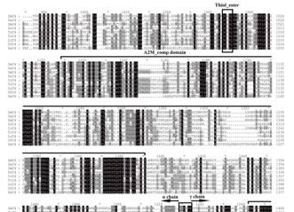 多重序列比對表明,硬骨魚和人的氨基酸高度保守。推導(dǎo)出的S.m-C4蛋白具有α-β連接子序列RXXR(在殘基668-671)和α-γ。連接序列RRXR(殘基1426-1429),其中C4氨基酸鏈被切割成三個鏈(α,β和γ鏈)。此外,保守的硫酯(GCGEQ)位點(diǎn)也定位在殘基1001至1005(圖5)。預(yù)測了TLR5由前21個氨基酸組成的信號肽和由14個氨基酸組成的跨膜螺旋。在膜結(jié)合型TLR5的LRR-CT中發(fā)現(xiàn)4個保守的半胱氨酸殘基,此外,還有9個蛋白結(jié)合區(qū)。結(jié)果表明,S.m-TLR5蛋白與銀大麻哈魚(91.5%)、大西洋鮭(91.7%)和衰白鮭(89.6%)的同源性較高,與鯉魚(48.1%)和金鯽(48.8%)的同源性較低。