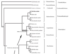 為了探究S.m-C4和S.m-TLR5免疫基因在魚類體內(nèi)的系統(tǒng)發(fā)育情況,中國淡水花羔紅點(diǎn)鮭與另外23條硬骨魚、兩條鯊魚和一條腔棘魚用于C4基因研究。重建貝葉斯系統(tǒng)發(fā)育中,四種鮭魚形魚類組合在一起,具有較高的后驗(yàn)概率(PP)(圖7)。同時(shí)三種鯉形目魚類和兩種鰓形目魚類分別用1.00 PP進(jìn)行分組,形成骨鰾總目分支。這一結(jié)果與傳統(tǒng)分類學(xué)和系統(tǒng)發(fā)育相一致。硬骨魚分為鰓形目、原鰓形目、鰓形目和棘鰓目四支,其中,兩條鯊魚是外群。