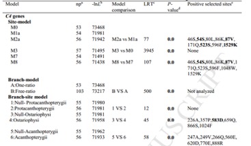 首先,利用位點(diǎn)模型探討C4基因中是否存在因其不同的分類地位和生存環(huán)境而正向選擇的位點(diǎn)。在模型中,只有M1a-M2a和M7-M8能夠檢測到正向選擇位點(diǎn)。M7-M8檢測到PP > 0.95的10個正向選擇位點(diǎn),其中9個位點(diǎn)也被M1a-M2a檢測到,表明魚C4基因的正向選擇。其次,利用分枝模型來探究這些正向選擇事件是否發(fā)生在特定的魚類譜系上,從而導(dǎo)致現(xiàn)在的魚或者祖先魚類。最后,利用分枝位點(diǎn)模型,在特定的現(xiàn)在和祖先譜系中檢測了這些位點(diǎn)。對于C6基因,M7-M8在正選擇壓力下僅檢測到一個位點(diǎn),而花羔紅點(diǎn)斑鮭或其他冷水魚中的分支位點(diǎn)未檢測到任何正選擇位點(diǎn)(表8)。