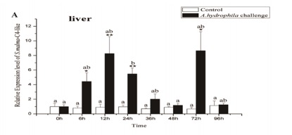 為探討這兩種免疫基因在細(xì)菌侵入的免疫應(yīng)答,采用定量實(shí)時(shí)PCR(qPCR)技術(shù),觀察注射后96h內(nèi)肝、脾臟相關(guān)基因的表達(dá)。對于鹽水處理組,即對照組,S.m-C4基因在研究的所有時(shí)間點(diǎn)肝臟中均無顯著差異(圖9)。對于嗜水氣單胞菌注射組,即實(shí)驗(yàn)組,肝臟在24小時(shí)有顯著增加(p=0.04),在12小時(shí)和72小時(shí)出現(xiàn)兩個峰值,邊緣顯著。在6h、12h、24h和72h,實(shí)驗(yàn)組與對照組有顯著性差異。對照組脾臟中S.m-C4基因的相對表達(dá)上下波動,8個時(shí)間點(diǎn)之間差異不顯著,實(shí)驗(yàn)組脾臟中S.m-C4基因的相對表達(dá)除72h外,其余時(shí)間點(diǎn)均無差異,與細(xì)菌注射組0 h相比減少59.6%。
