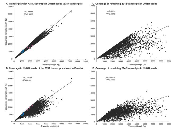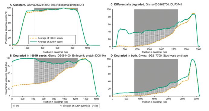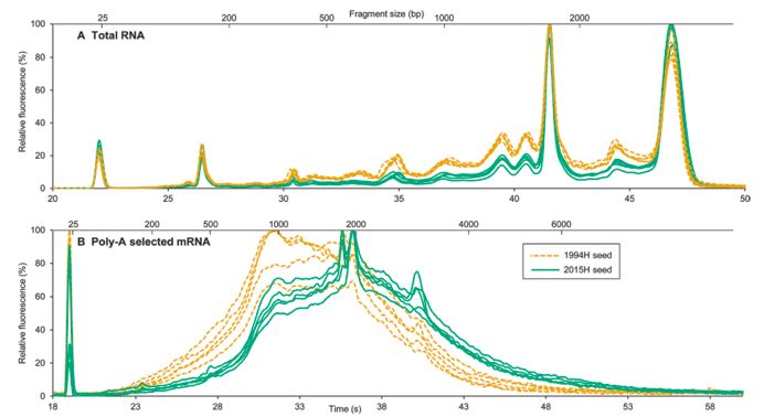 在相隔21年的種子的胚軸中比較mRNA的降解,2015H和1994H分別顯示未衰老和增加衰老癥狀。使用全分子cDNA無打斷的測序方法對RNA進行測序。發(fā)現(xiàn)一些轉錄本在兩個群組中均有降解,但在1994H種子的組織中觀察到更多的損傷。損傷主要由于片段碎裂造成,如電泳圖譜的變化,轉錄本覆蓋長度和測序深度所示。幾乎沒有證據(jù)表明轉錄本丟失或引起了氧化損傷。降解轉錄本中片段大小的連續(xù)分布以及轉錄本長度和降解之間的正相關支持了通過隨機片段化造成mRNA降解的假設,這與氧化事件引起死亡的假設一致。