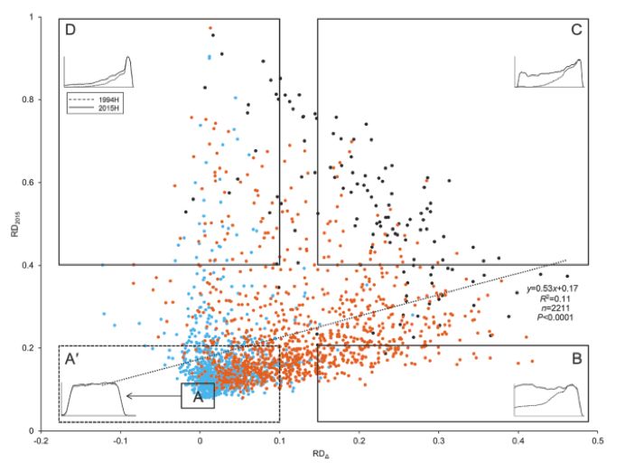 圖3. 比較2015H和1994H每個位置的轉錄本reads之間的平均歸一化測序深度