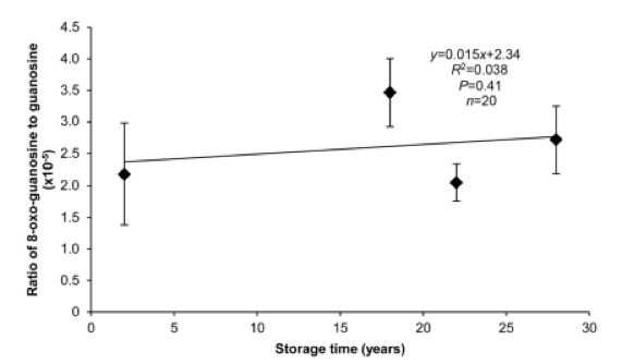 來自5’末端的轉錄本降解可以反映年齡相關的RNA氧化。最容易氧化的堿基,8-oxo-guanosine的豐度與總RNA中鳥苷豐度的比例與1989,1995,1999和2015年收獲的大豆種子胚軸的貯藏時間無關(圖5)。