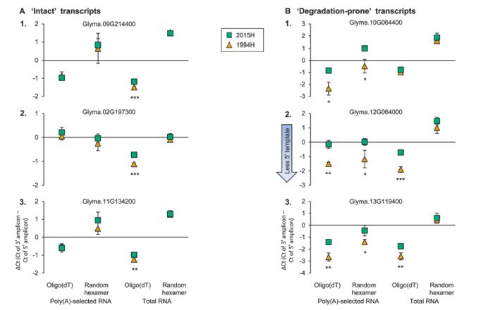 通過qPCR的方法對區(qū)域A(無降解)的三種轉錄本和區(qū)域B的三種轉錄本(僅在1994H種子組織中顯著降解)的完整性進行驗證,結果顯示:區(qū)域A的轉錄本,在組內cDNA文庫中5’和3’擴增的cDNA模板相似,且三個cDNA文庫ΔCt值沒有差異,樣本2015H和1994H之間有較小差異。與完整轉錄本相反,對于易于降解的轉錄本,ΔCt值在群組之間顯著不同(區(qū)域B)。在1994H樣品中,5’比3’擴增模板豐度低,產(chǎn)生負ΔCt值,在2015H樣品中,兩種擴增模板豐富度相似。