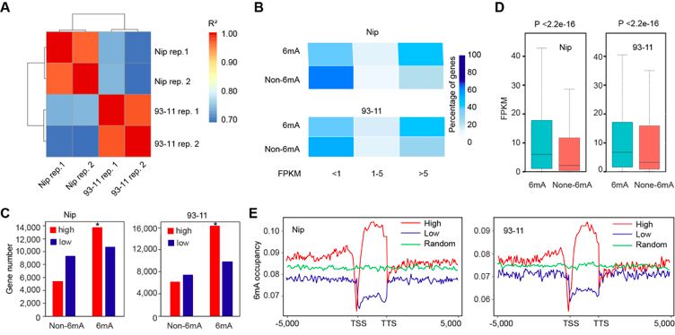 RNA-seq分析表明在Nip和93-11中,在6mA位點有大量的高表達(dá)基因甲基化,大量未甲基化基因在低水平表達(dá)。6mA甲基化基因的表達(dá)水平顯著高于非6mA基因,并且高表達(dá)基因顯示出較高的6mA占用率,特別是在啟動子和基因體區(qū)域中包含6mA位點的基因。6mA與水稻中的活性表達(dá)基因有關(guān)。5mC在水稻基因組中高豐度存在,影響基因表達(dá),研究發(fā)現(xiàn)5mC和6mA之間沒有相關(guān)性(圖4)。