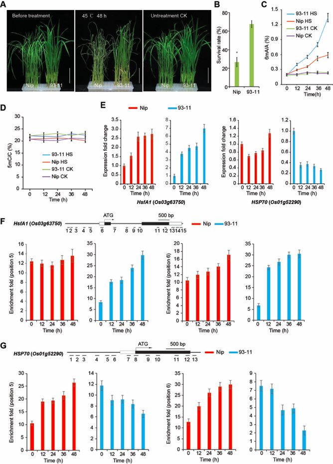 根據(jù)SMRT測序結(jié)果,篩選出候選的6mA修飾的熱脅迫相關(guān)基因,如熱休克轉(zhuǎn)錄因子A1(HsfA1)和熱休克蛋白70(HSP70)。HSFA1是熱脅迫反應(yīng)的主要轉(zhuǎn)錄調(diào)控因子,其在非脅迫條件下受到HSP70的抑制。HSFA1功能缺失導(dǎo)致熱脅迫敏感表型。HsfA1和HSP70表達(dá)的變化與其6mA水平的變化呈正相關(guān),這可能是Nip和93-11之間熱脅迫耐受性差異的原因。