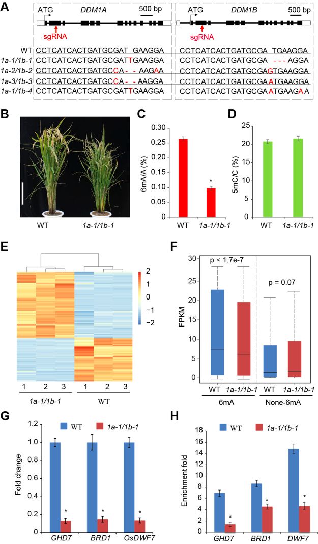 水稻基因組含有兩個DDM1同源基因DDM1a和DDM1b,由于功能冗余,只有T-DNA插入單突變體產(chǎn)生的雙突變體DDM1a/1b表現(xiàn)出發(fā)育表型。然而,DDM1a/1b不產(chǎn)生活花粉,導(dǎo)致種子呈空殼和深色。用CRISPR-Cas9對Nip背景中的DDM1a和DDM1b進(jìn)行了有針對性的誘變,并鑒定了10個獨立的T1系用于DDM1a、DDM1b單突變和4個獨立的DDM1a/DDM1b(1a/1b)雙突變型。在任何不同類型的DDM1a或DDM1b純合子單突變體中均未觀察到表型。與野生型植物相比,所有純合1a/1b系表現(xiàn)出相同的矮化表型。1a-1/1b-1顯示出降低的結(jié)實率,而另外3個雙突變體顯示不育。LC-MS/MS對DNA甲基化水平的定量測量顯示6mA水平顯著降低,但1a/1b植物中5mC水平變化不大。6mA-IPqPCR分析顯示,6mA水平在大多數(shù)隨機(jī)選擇的位點中顯著降低。RNA-seq結(jié)果表明野生型中6mA修飾基因的表達(dá)水平顯著高于1a-1/1b-1植物中的相同基因,野生型中非6mA基因與1a-1/1b-1植物中的相應(yīng)基因之間沒有表達(dá)水平差異。結(jié)果表明6mA水平與基因表達(dá)呈正相關(guān)。