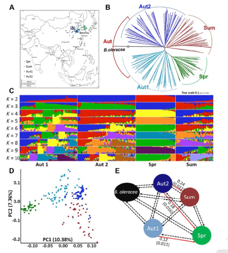 通過?K分析發(fā)現(xiàn)194個(gè)樣品分成4個(gè)代表種群是較好的模型,增加K值從2到10,等到的模型見上圖C,在K=2或3時(shí),春大白菜能夠清晰的從其他群里分出來,在K=4時(shí),秋大白菜被分為兩個(gè)群,定義為Aut1和Aut2,這個(gè)結(jié)果也被主成分分析支持(PCA),如上圖D所示。