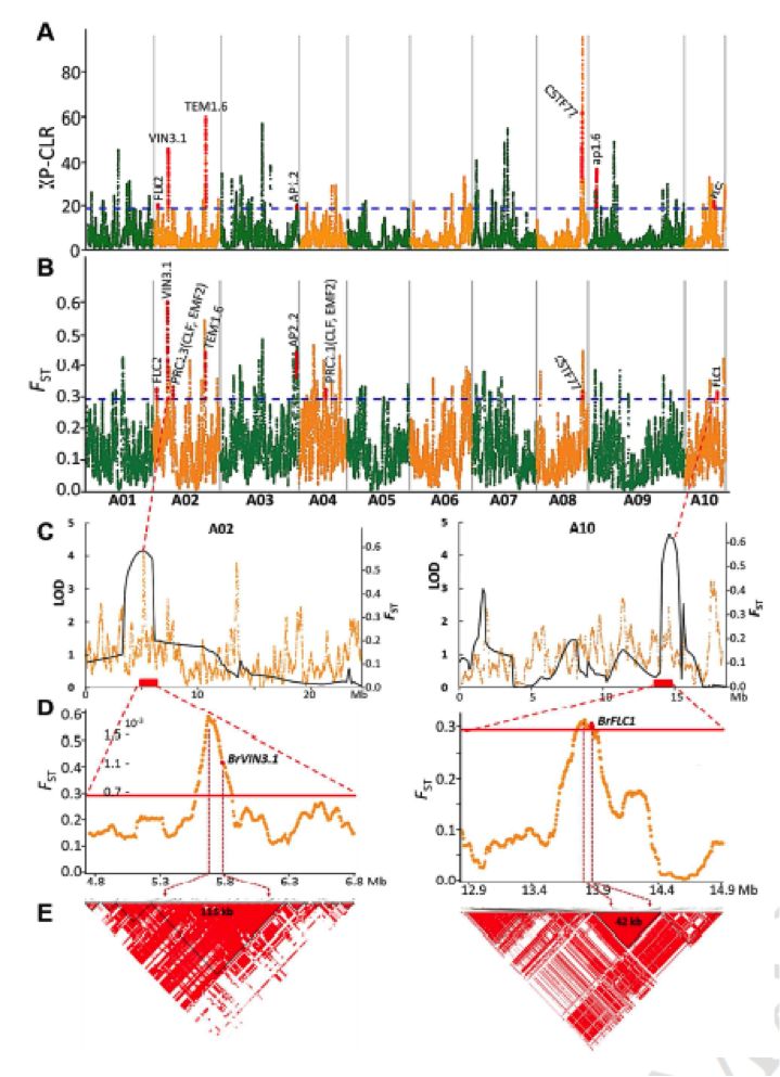 構(gòu)建了一個(gè)遺傳圖譜進(jìn)行QTL定位以找到抽薹時(shí)間相關(guān)的區(qū)域,一共找到了7個(gè)QTLs,其中QTLs ftA02.1 and ftA10.1被發(fā)現(xiàn)在受選擇的兩個(gè)候選區(qū)域內(nèi)。通過多年對(duì)表型變化影響的反復(fù)檢測(cè),推測(cè)它們參與了抽薹時(shí)間的調(diào)控。