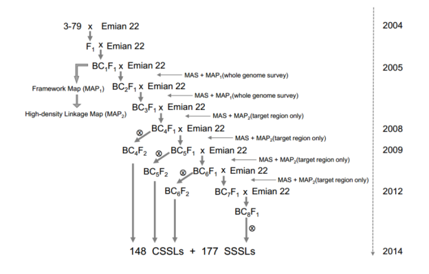 著絲粒區(qū)域鑒定:blastn,SPSS software (version 17.0)?;基因組共線性分析:MUMmer (version 3.23),GATK(version 3.1.1),Samtools(version 0.1.19)?,MCScanX package;結(jié)構(gòu)變異檢測(cè):MUMmer3 (version 3.23);二倍體棉重測(cè)序SNPs鑒定:Trimmomatic (version 0.32),BWA;168個(gè)CSSLs群體SNPs鑒定:染色體片段置換系(CSSLs)的構(gòu)建(圖1),測(cè)序深度(6X),插入片段:350 bp,BWA,GATK和Samtools;CSSLs群體QTLs定位與表達(dá)分析:QTL IciMapping (version 4.0)?;TopHat2 (version 2.0.13)?;Cufflinks (version 2.2.1);STRUCTURE (version 2.3)?;TASSEL software (version 5.0)?;