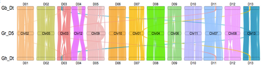 四倍體陸地棉和海島棉基因組的組裝使得研究人員能夠進(jìn)一步探索四倍體棉亞基因組和其二倍體祖先之間的基因組差異。首先通過(guò)對(duì)具有D型基因組的13份二倍體材料進(jìn)行重測(cè)序分析,分析顯示在兩種四倍體棉D-亞基因組具有相同的二倍體祖先種雷蒙德氏棉G. raimondii(D5 genome,D亞基因組供體);進(jìn)而利用二倍體雷蒙德氏棉G. raimondii直接進(jìn)行基因組比較分析,發(fā)現(xiàn)四倍體陸地棉和海島棉與雷蒙德氏棉相比,都有一些獨(dú)特的結(jié)構(gòu)變異,如在海島棉染色體D05和陸地棉D12中均存在大的染色體臂間倒位,暗示這些變異出現(xiàn)在多倍化之后(圖5)。研究人員還觀察到兩個(gè)四倍體相對(duì)于G. raimondii共有一些結(jié)構(gòu)變異,例如染色體D09中兩個(gè)四倍體發(fā)生了大的反轉(zhuǎn)(圖5)。研究中同時(shí)運(yùn)用了二倍體祖先種亞洲棉G. arboreum(A2 genome,A亞基因組供體)的Hi-C數(shù)據(jù),與陸地棉和海島棉A亞基因組進(jìn)行比對(duì),檢測(cè)棉由二倍體到四倍體多倍化過(guò)程中發(fā)生的結(jié)構(gòu)變異,Hi-C具體矩陣圖顯示在13條染色體中發(fā)生了大規(guī)模的染色體重排,其中發(fā)部分變異為兩個(gè)四倍體的棉的A亞基因組共有。研究中發(fā)現(xiàn)染色體A06中*大的染色體臂間倒位(in2)在陸地棉中是特有的(圖3?左),表明這種結(jié)構(gòu)變異可能在染色體多倍化后發(fā)生。因此得出結(jié)論,二倍體棉花中的A基因組在異源多倍化后被重組,導(dǎo)致不同四倍體(陸地棉和海島棉)中發(fā)生了大染色體倒位。