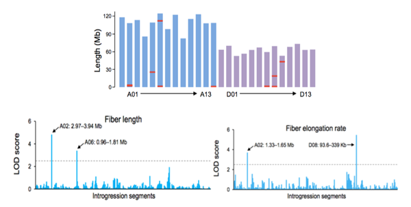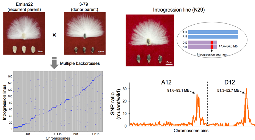通過(guò)研究發(fā)現(xiàn)了在陸地棉(G.?hirsutum?acc. TM-1)和海島棉(G. barbadense?acc. 3-79)間存在廣泛的遺傳變異,進(jìn)一步推測(cè)這些變異的一部分可能是造成表型差異的原因,包括纖維性狀。為了利用這些變異進(jìn)行定向育種,研究人員構(gòu)建了一個(gè)漸滲系群體,旨在引入有利的變異,控制從G.barbadense到G. hirsutum等重要農(nóng)藝性狀的形成,如纖維質(zhì)量。研究人員通過(guò)分子標(biāo)記對(duì)168份漸滲系材料進(jìn)行測(cè)序,并鑒定了涵蓋所有26條染色體的466個(gè)基因滲入片段(圖6)。研究人員發(fā)現(xiàn)了在染色體D12中含有漸滲片段的漸滲系,其具有有限的絨毛纖維,類似于其供體親本G.barbadense?3-79(圖6,圖7上),基因滲入片段的位置與無(wú)絨天然突變體G. hirsutum?Xuzhou142fl的圖譜測(cè)序所示的位置相同,然而其遺傳基礎(chǔ)以前未被充分了解(圖7下)。這些結(jié)果表明,陸地棉(G. hirsutum)中無(wú)絨毛突變體的遺傳變異與海島棉(G. barbadense)中的數(shù)量性狀基因座(QTL)共定位。該漸滲片段與天然纖維突變體的特征將有助于比較分析海島棉和陸地棉之間的絨毛纖維起始機(jī)制。
