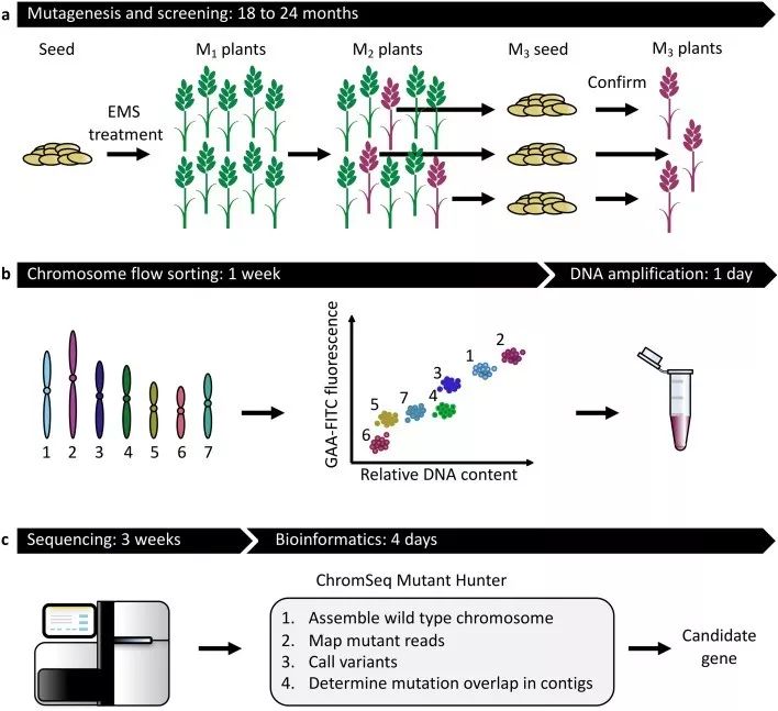 TILLING,即Targeting Induced Local Lesions IN Genomes(定向誘導(dǎo)基因組局部突變技術(shù)),是由Steven Henikoff領(lǐng)導(dǎo)的研究小組發(fā)展起來的,TILLING技術(shù)借助高通量的檢測手段,快速有效地從由化學(xué)誘變劑(EMS)誘變過的突變?nèi)后w中鑒定出點(diǎn)突變。目前此技術(shù)廣泛應(yīng)用于作物研究中,另外還有基因全基因組重測序的MutMap和MutMap +方法,實(shí)現(xiàn)功能基因的快速定位。MutRenSeq和MutChromSeq也應(yīng)用于突變基因定位,2016年John Innes Centre組織利用EMS誘變產(chǎn)生的小麥突變體,使用液相捕獲技術(shù),通過特異性的RNA捕獲探針對目標(biāo)區(qū)域進(jìn)行富集,二代測序后,通過比對野生型和抗性突變體的序列,找到了目標(biāo)抗性基因。MutChromSeq在此基礎(chǔ)上進(jìn)行改進(jìn),利用流式細(xì)胞儀技術(shù)將含目標(biāo)基因的單條染色體分離出來,后期結(jié)合高通量測序,通過比較突變體及野生型的差異,快速克隆基因,此方法大大降低重測序的難度,減少了其它染色體序列對目標(biāo)序列的影響。