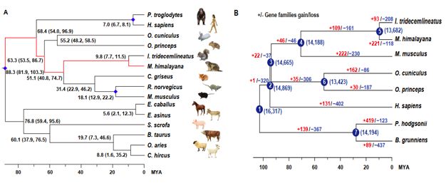 2.系統(tǒng)發(fā)育樹構(gòu)建與分化時間估算:利用15個物種(小鼠,大鼠,倉鼠,喜馬拉雅旱獺,松鼠,鼠兔,兔子,人類,黑猩猩,山羊,綿羊,牛,豬,驢和馬)的4,573個單拷貝直系同源基因構(gòu)建系統(tǒng)發(fā)育樹,MUSCLE,phyML,分化時間估算PAML MCMCtree;