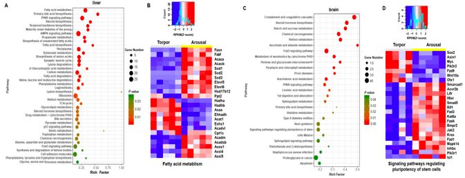 與其它高原哺乳動物不同,喜馬拉雅旱獺在冬季冬眠。為了闡述旱獺冬眠的分子機制,研究人員分析了來自喜馬拉雅旱獺肝臟和大腦的RNA-seq數(shù)據(jù),以表征在冬眠/覺醒周期中基因表達的變化。差異表達的基因(DEGs)顯著富集在肝臟中脂肪酸代謝,萜類骨架生物合成和初級膽汁酸生物合成的途徑(圖3 A)。并清楚地觀察到在冬眠狀態(tài)下,參與脂肪酸降解的基因的上調(diào)及參與脂肪酸合成的基因的下調(diào),暗示了一個√確的脂質(zhì)代謝調(diào)節(jié)機制(圖3 B)。此外,還發(fā)現(xiàn)在覺醒狀態(tài)下,包含與藥物代謝相關(guān)的基因-細胞色素P450,氨基酸的生物合成和碳水化合物分解代謝相關(guān)基因的總體下調(diào)。