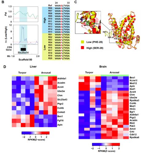 為了更好地了解喜馬拉雅旱獺的高原適應(yīng)性機制,研究人員從極高海拔(海拔> 4,500 m,n = 10)和相對低海拔(<1,900 m,n = 10)收集了20只喜馬拉雅旱獺。研究人員首先測量了血液參數(shù),發(fā)現(xiàn)與低海拔喜馬拉雅旱獺相比,高海拔喜馬拉雅旱獺的一些血液相關(guān)性狀,尤其是紅細胞計數(shù),血紅蛋白濃度和平均紅細胞體積顯著增加。接下來,對每個喜馬拉雅旱獺進行了全基因組測序,并在喜馬拉雅旱獺基因組中搜索了具有高種群分化(Fst)和多樣性比率(qp,low/qp, high)的區(qū)域,最終鑒定了分布在喜馬拉雅土撥鼠基因組不同scaffolds?中的24.84 Mb受選擇的區(qū)域。這些區(qū)域含有383個功能基因,與非選擇性基因相比,這些基因具有更高的Ka / Ks值(P <0.01),主要功能類別包括“缺氧反應(yīng)”,“DNA修復”,“血管生成”,“心臟功能”,“脂肪酸代謝”,“細胞周期”,“發(fā)熱”和“鈣信號通路”。參與缺氧誘導因子-1(HIF-1),血管內(nèi)皮生長因子(VEGF)或其它缺氧相關(guān)信號通路的10個功能基因,包括Slc25a14,Nox-1,Hmox1,Vegfr2,Atg16l2,Bex1,Ptgr2,Gprasp1,F(xiàn)am46d?和Chd3,在高海拔和低海拔群體之間顯示出明顯的基因分型差異(圖4 A)。在Slc25a14中發(fā)現(xiàn)了非同義替換(由Ser28取代Phe28,F(xiàn)28S),其顯示出*強的分化信號(FST = 0.73)(圖4 A和B)?;谕唇5腟lc25a14的三維結(jié)構(gòu)顯示,F(xiàn)28S替換發(fā)生在N末端的loop區(qū)域,并且由于氨基的電荷和極性的變化而增加其與相鄰的α-螺旋的距離(圖4 C)。為了進一步評估這一變體的功能影響,研究人員將突變體Slc25a14與其在不同哺乳動物中的直系同源基因進行比對,并發(fā)現(xiàn)Phe28在比對的其它動物中高度保守。該突變體功能影響的預測證明F28S取代是有害的,所有這些結(jié)果都表明F28S突變可能是高海拔群體Slc25a14選擇性清除的結(jié)果。為了推測旱獺高海拔適應(yīng)和冬眠的遺傳適應(yīng)性機制,研究人員在選擇性清除區(qū)域鑒定到了116個差異表達基因,在這些基因中,25個差異表達基因與HIF-1途徑相關(guān),主要屬于DNA修復,血管生成,脂肪酸代謝,細胞凋亡/細胞周期和發(fā)熱的類別相關(guān)。在冬眠/覺醒周期中,大量選擇性清除基因具有差異表達,表明這兩種生物學過程之間存在共同的遺傳影響(圖4 D)。在這些基因中,Bex1, Apln, kcne1l, Med12, Dad1和Fgf16在冬眠階段肝臟或腦中顯著上調(diào)(圖4 D),進一步證明這些基因參與冬眠和高原適應(yīng)性,先前的研究報道了這些基因參與許多生理過程,包括神經(jīng)元分化,肝再生,血管生成和能量代謝,而這需要進一步的實驗驗證。