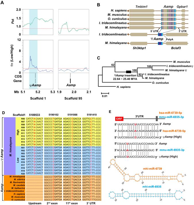 假基因逐漸被認定為是適應(yīng)性表型多樣化的重要調(diào)節(jié)因子,與選擇性清除信號相關(guān),研究人員鑒定了27個參與極高海拔適應(yīng)的候選假基因,占全基因組范圍內(nèi)假基因的1.83%。這一比率幾乎與具有1.78%的功能基因的比率相當,表明它們在極端環(huán)境的適應(yīng)性中的作用不可忽略。與蛋白質(zhì)編碼基因中發(fā)現(xiàn)的群體基因型差異一致,研究人員在高海拔群體中觀察到受選擇的假基因中幾乎固定的突變,例如ΨAamp,ΨAdl1和ΨRnf114。在這些假基因中,血管相關(guān)的遷移細胞蛋白假基因(ΨAamp)具有完整的基因結(jié)構(gòu)并顯示出*高的Fst值(Fst = 0.67),但ΨAamp未被檢測為受選擇性基因(圖4 A和5 A)。ΨAamp的結(jié)構(gòu)顯示它是一個整合的加工假基因,其mRNA通過逆轉(zhuǎn)錄被插入基因組中(圖5 B)。這個假基因含有過早終止密碼子(第208個核苷酸,C> T),缺失/插入和移碼突變,使其不能翻譯成功能性的蛋白,Aamp和ΨAamp的共線性分析表明在不同哺乳動物中Aamp是高度保守的。然而,在地松鼠和喜馬拉雅旱獺中發(fā)現(xiàn)并保存了高度保守的共線性位點(圖5 B),進一步的系統(tǒng)發(fā)育分析表明,ΨAamp和Aamp屬于兩個獨立的分支,基于序列分歧插入時間的估算暗示假基因的插入事件發(fā)生在約22.64~25.40 MYA,在喜馬拉雅旱獺和地松鼠分化之前(圖?5 C)。這些發(fā)現(xiàn)支持古老的假基因?qū)τ谒墒缶哂刑禺愋圆墓餐淖嫦冗z傳而來這一假設(shè),然而,與地松鼠相比,喜馬拉雅旱獺顯示Aamp和ΨAamp之間的序列距離較小,這表明存在選擇性壓力來維持旱獺的遺傳元素。