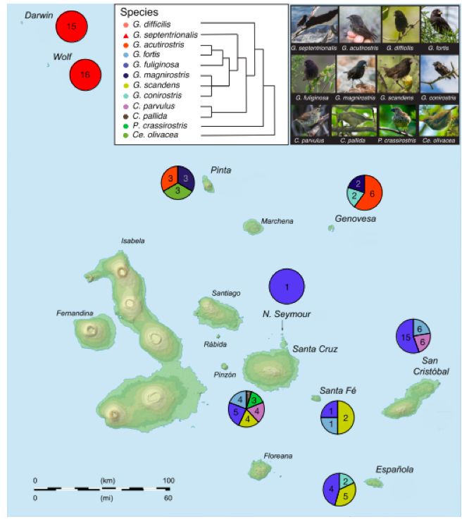 餅狀圖:不同島嶼上每種達(dá)爾文雀糞便樣本的數(shù)量;系統(tǒng)發(fā)育樹(shù)狀圖:目標(biāo)達(dá)爾文雀的進(jìn)化關(guān)系。