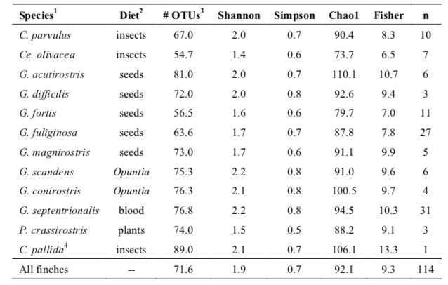 表1.?達(dá)爾文雀的樣本大小、食性分類(lèi)以及α多樣性