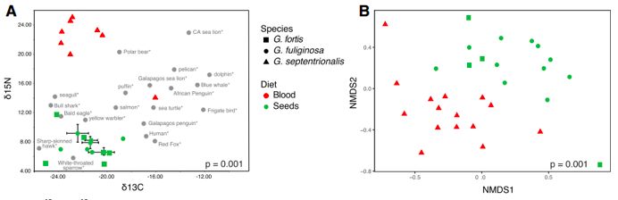 嗜血達(dá)爾文雀:以鰹鳥(niǎo)(一種熱帶海鳥(niǎo))血液和卵為食,而鰹鳥(niǎo)以魚(yú)類(lèi)為食,因此嗜血達(dá)爾文雀與海洋肉食動(dòng)物δ15N結(jié)果相似,而其他島上的達(dá)爾文雀以種子和昆蟲(chóng)為主。δ15N結(jié)果顯示:嗜血達(dá)爾文雀與G. fortis和G.fuliginosa食性差異顯著(p<0.0001),但與海洋食肉動(dòng)物(北極熊、海獅)更近(圖. 3A)。NMDS結(jié)果顯示:嗜血達(dá)爾文雀腸道微生物結(jié)構(gòu)明顯區(qū)別于G.fortis和G.?fuliginosa(圖. 3B)。
