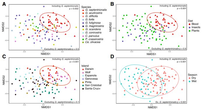 采樣:9個(gè)地緣隔離島,12種達(dá)爾文雀,114個(gè)糞便樣本,2個(gè)季度(旱季+雨季)。
