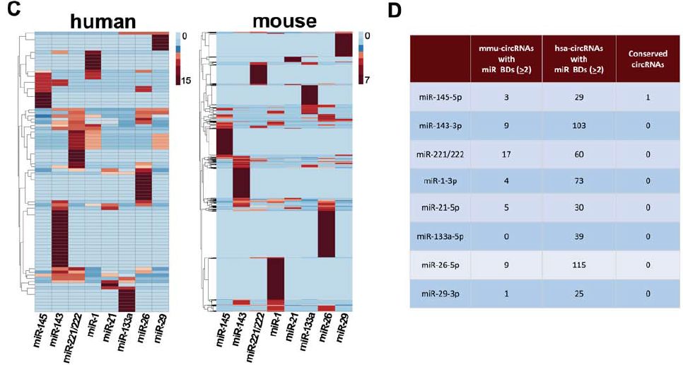 小鼠主動(dòng)脈的三個(gè)生物學(xué)重復(fù)(RNA提取前去除了內(nèi)膜和外膜層),鑒定人類和小鼠VSMCs之間保守的circRNA;