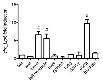 divergent primer擴(kuò)增cDNA和gDNA,驗(yàn)證其來源于可變剪接;RNAse R抗性檢測;放線菌素D處理抑制轉(zhuǎn)錄證實(shí)circRNA的穩(wěn)定性(更長的turn-over時(shí)間);qRT-PCR檢測各組織中circ_Lrp6表達(dá)水平并結(jié)合RNA-seq數(shù)據(jù)進(jìn)行分析:circ_Lrp6和Lrp6在血管中富集。