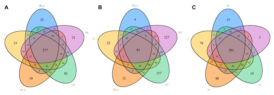物種分類柱狀圖是表示HMD、MMD和SMD樣本中物種的組成及對應(yīng)物種在該樣本中的相對豐度。HMD、MMD和SMD樣本中在門水平和屬水平相對豐度前10的物種如圖5所示。無論是否存在腹瀉的樣本中,厚壁菌和擬桿菌都是主要的優(yōu)勢菌。然而,健康森林麝的糞便中厚壁菌的相對豐度明顯高于腹瀉麝。厚壁菌是構(gòu)成食物中纖維素分解代謝并將纖維素降解為宿主揮發(fā)性脂肪酸的主要細菌類型。此外,厚壁菌門還可以調(diào)節(jié)體內(nèi)免疫反應(yīng),抑制病原體的侵襲和預(yù)防腸道炎癥。腹瀉麝腸道中厚壁細胞豐度的減少可能會同時降低該物種的消化生理功能。另外,β多樣性的比較顯示,健康和腹瀉森林麝的細菌群落差異極顯著,這與麝的異常消化生理功能有關(guān)。HMD、MMD和SMD三組不同樣本之間共有OTU和特有OTU數(shù)量如圖6所示。