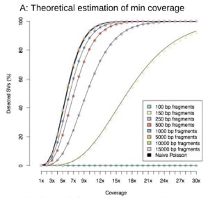 根據(jù)兩個人類數(shù)據(jù)集的錯誤情況和read長度,作者對兩條人的染色體模擬了50X?Pacbio?和ONT?read 。純粹的統(tǒng)計分析發(fā)現(xiàn),近10X覆蓋度的數(shù)據(jù)(平均長度10kb)就足夠去推斷所有SV斷點(一瞬間覺得自己可以省好多錢有木有),然而對于100bp的短read雙端測序至少要25X覆蓋度。當前這個統(tǒng)計只是一個理想情況,比如缺乏了重復(fù)和覆蓋度的偏移,因此是低估了所需的覆蓋度的。