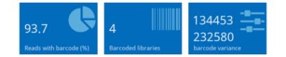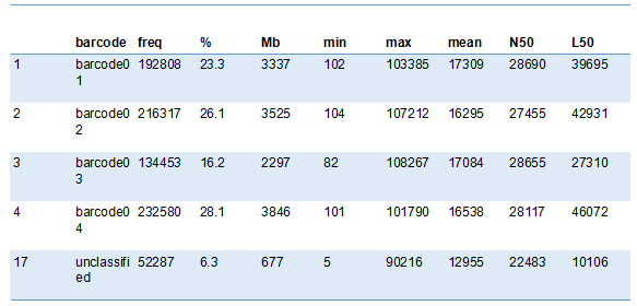 在加入barcode序列混樣測序的情況下,barcode識別區(qū)分的結果展示如下,包括barcode識別效率,區(qū)分的文庫個數(shù)及每個文庫中序列個數(shù)占比和長度信息等。