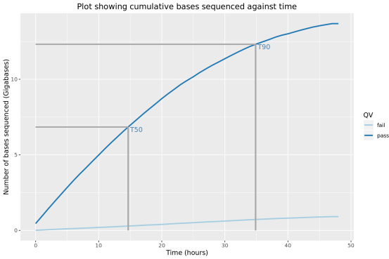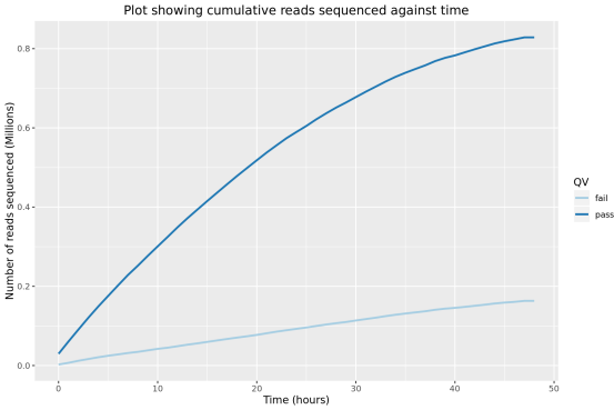 上述分析完成后會將分析結果存放至HTML文件,可用瀏覽器打開Nanopore_SumStatQC_Tutorial.html進行查看。對單個芯片約1M reads分析的部分結果展示如下(結果來自教程,堿基識別使用Guppy 2.1.3,根據(jù)識別序列的平均質量值將其分為pass和fail兩種,質量值閾值默認為7):