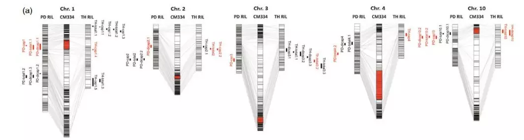 QTL定位結(jié)果:利用120個PD單株構(gòu)建的重測序遺傳圖譜和3個環(huán)境下的56個單株表型數(shù)據(jù)定位到22個QTL位點。其中LOD值最高的是PD-dicap1.1 (LOD=8.7),表型變異率(R2)最高的是PD-dicap10.2 (28.8%)。同樣地,85個TH單株構(gòu)建的簡化圖譜和2個環(huán)境的表型數(shù)據(jù)定位到22個QTL位點。其中LOD值(LOD=9.9)和R2(18.8%)最高的都是TH-cap2.2。兩者分析時均用CM334作為參考基因組,因此可以對2個群體的QTL定位結(jié)果進行比較,發(fā)現(xiàn)PD群體的9個QTL位點與TH群體的7個QTL位點的物理位置重疊。