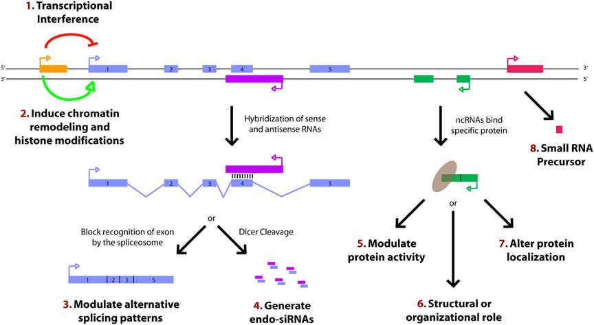 3.與基因轉(zhuǎn)錄本形成互補(bǔ)雙鏈,干擾mRNA的剪切,形成不同的剪切形式;