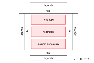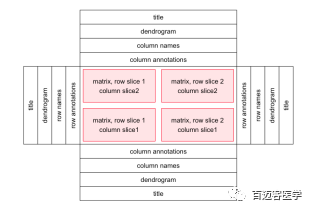 單個熱圖由熱圖主體和熱圖組件組成。 熱圖主體可以按行和列分割。 熱圖組件是標題,樹形圖,矩陣名稱和熱圖注釋,它們放在heamap體的四個側面上。