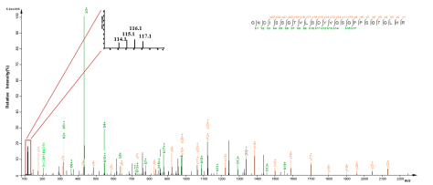 在質譜圖中,任何一種iTRAQ試劑標記的不同樣本中的同一蛋白質表現(xiàn)為相同的質荷比。在串聯(lián)質譜中,報告基團、質量平衡基團和多肽反應基團之間的鍵斷裂,質量平衡基團丟失,帶不同同位素標簽的同一多肽產生質量為114,115,116和117Da(八標為113、114、115、116、117、118、119和121 Da)的報告離子(Fig.3中紅色標記),根據報告離子的豐度可獲得樣品間相同肽段的定量信息,再經過軟件處理得到蛋白質的定量信息。