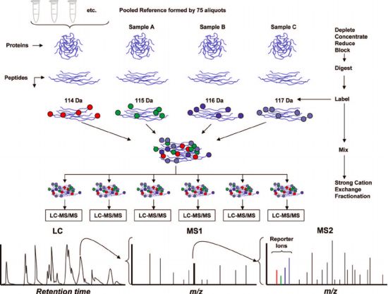 (1)不同樣本標記之后混樣,統(tǒng)一處理上機,減少了分別上機造成的實驗誤差,并利用同位素標簽的豐度來檢測,定量更z確,重復性更好;