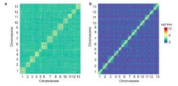 注:a. Hi-C數(shù)據(jù)與亞洲棉原基因組比對(duì);b. Hi-C數(shù)據(jù)與亞洲棉更新基因組比對(duì)