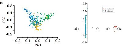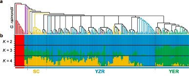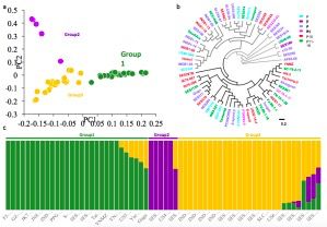 共計(jì)選擇了243份二倍體棉花材料:230份亞洲棉G. arboreum?(A2)?和13份草棉G. herbaceum?(A1),來(lái)自于中國(guó)南部(SC),長(zhǎng)江(YZR)和黃河(YER)。以雷蒙德氏棉(G. raimondii)為外群,構(gòu)建系統(tǒng)發(fā)育樹(shù)顯示,G. herbaceum(草棉)和G. arboretum(亞洲棉)聚類(lèi)成2個(gè)獨(dú)立的群(見(jiàn)圖2a和b)。G. arboretum(亞洲棉)進(jìn)一步又分為SC,YZR和YER三個(gè)群,顯示了地理分布模式的差異,進(jìn)而利用PCA分析支持這一結(jié)果(見(jiàn)圖2c)。