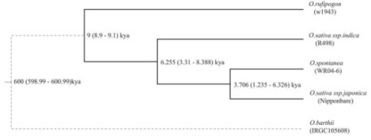 利用OrthoMCL軟件檢測(cè)WR04-6、R498、Nipponbare和W1943(O. rufipogon)間核心的、非必須的和共有的基因家族。在WR04-6中鑒定到了909個(gè)擴(kuò)張的基因家族,并且通過(guò)通路分析顯示,這些基因在光合作用和呼吸作用中顯著富集(p<0.01),例如氧化磷酸化、光合作用和核糖體的KEGG途徑,考慮其可以作為遺傳改良的信號(hào)。以O. barthii作為外群構(gòu)建的進(jìn)化樹(shù)顯示W(wǎng)R04-6與粳稻祖先的分化時(shí)間估計(jì)在3,706ya(1,235ya-6,326ya),見(jiàn)圖4。