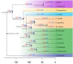 比較基因組分析:直系同源基因鑒定:?OrthoMCL (version 2.0);系統(tǒng)發(fā)育樹(shù)構(gòu)建與分化時(shí)間估算:?MUSCLE、Gblocks (version 0.91b)和RaxML(version 8),MCMCTREE評(píng)估分化時(shí)間;基因家族擴(kuò)張和收縮分析:CAFE(vertion 3.1);染色體共線性分析、4DTV檢測(cè)及Ks值計(jì)算:MCscan。