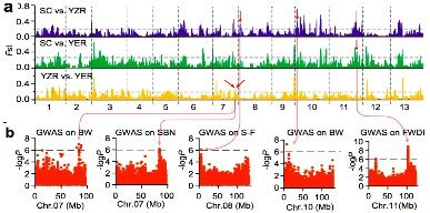 人工選擇在農(nóng)作物的馴化和遷徙的過(guò)程中具有重要的作用。群體結(jié)構(gòu)分析顯示當(dāng)K=4時(shí),YER與SC和YZR明顯不同(圖2b,K=4)。通過(guò)兩兩群體間的選擇性清除分析(FST)鑒定出了分別覆蓋到59,53和51個(gè)顯著遺傳分化的區(qū)域。SC和YZR之間的21個(gè)分化的區(qū)域(約43.5 Mb?含有915個(gè)基因)在群體SC和YER之間是保守的(圖3a)。對(duì)來(lái)自不同環(huán)境下的11個(gè)重要性狀進(jìn)行全基因組關(guān)聯(lián)分析,在98個(gè)顯著關(guān)聯(lián)的信號(hào)中,其中25信號(hào)個(gè)來(lái)自基因區(qū)(外顯子或內(nèi)含子區(qū)),包含與形態(tài)性狀相關(guān)的8個(gè)信號(hào)區(qū),與產(chǎn)量性狀相關(guān)的6個(gè)信號(hào)區(qū),與油籽性狀相關(guān)的3個(gè)信號(hào)區(qū);剩余73個(gè)信號(hào)來(lái)自非編碼區(qū)。大部分農(nóng)藝性狀的GWAS關(guān)聯(lián)信號(hào)中顯示地理差異,如分支數(shù),開(kāi)花期,鈴重和抗病性這些性狀定位在保守的基因區(qū)(圖4b)。