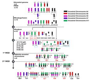 圖2 禾本科染色體數(shù)進(jìn)化(高粱n = 10到甘蔗n = 8)